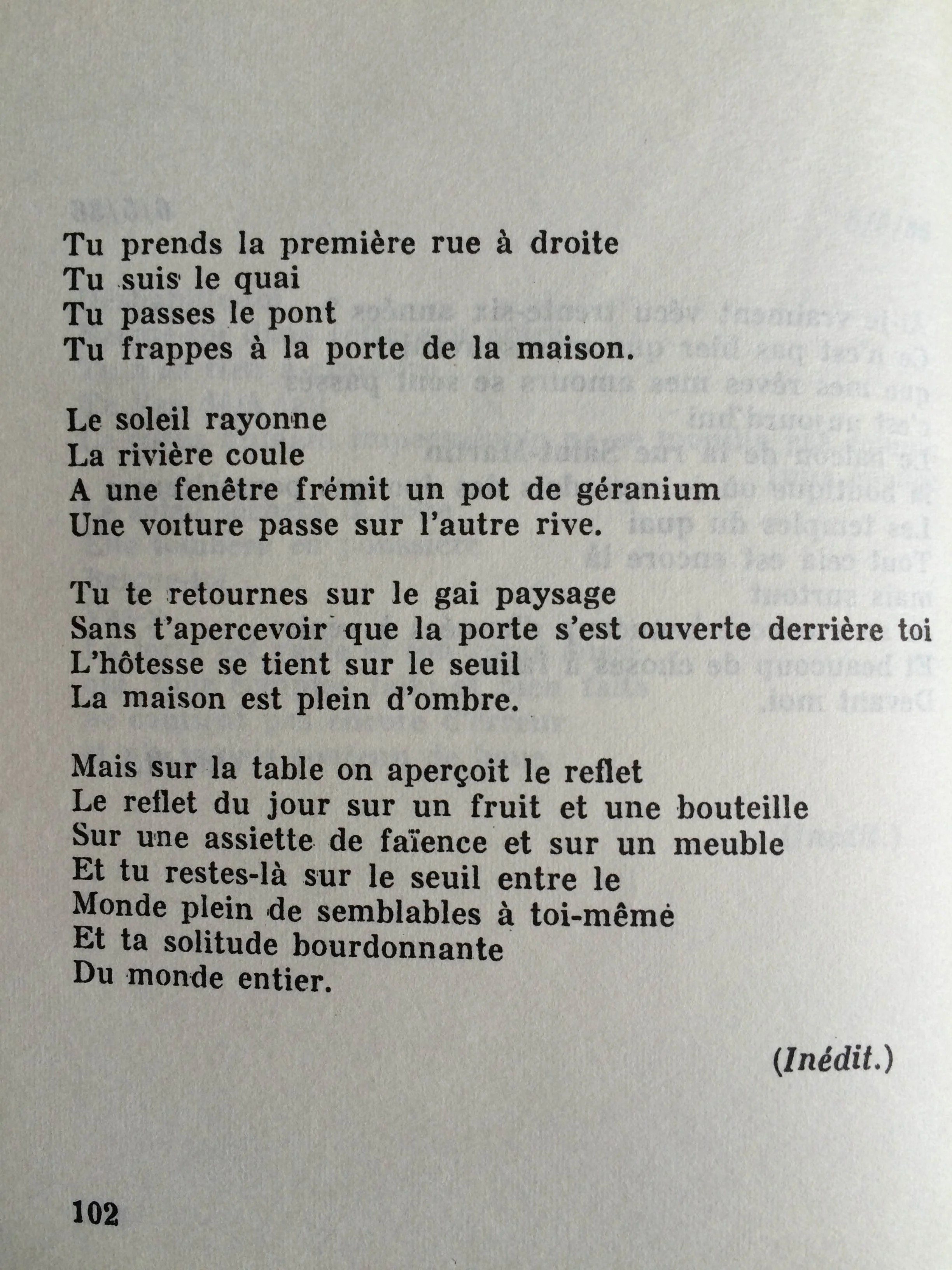 Se parler (parler à ou de soi ?) à la deuxième personne. C’est ce que tu fais, Robert. Tu m’enchantes (me chantes ?) et je parle au souvenir de tes mots. Je la vois, ta fenêtre au géranium. Il est rouge. Je n’ai que peu d’attrait pour ces fleurs, trop robustes, trop grasses, trop pleines de vie. Une fleur, c’est déjà le signe de la mort. Ta rivière est scintillante ta pensée vagabonde tes sens éveillés par le bourdonnement des abeilles. Mais…qui est cette réalité qui se tient sur le seuil et te hante dans les rêves ?
