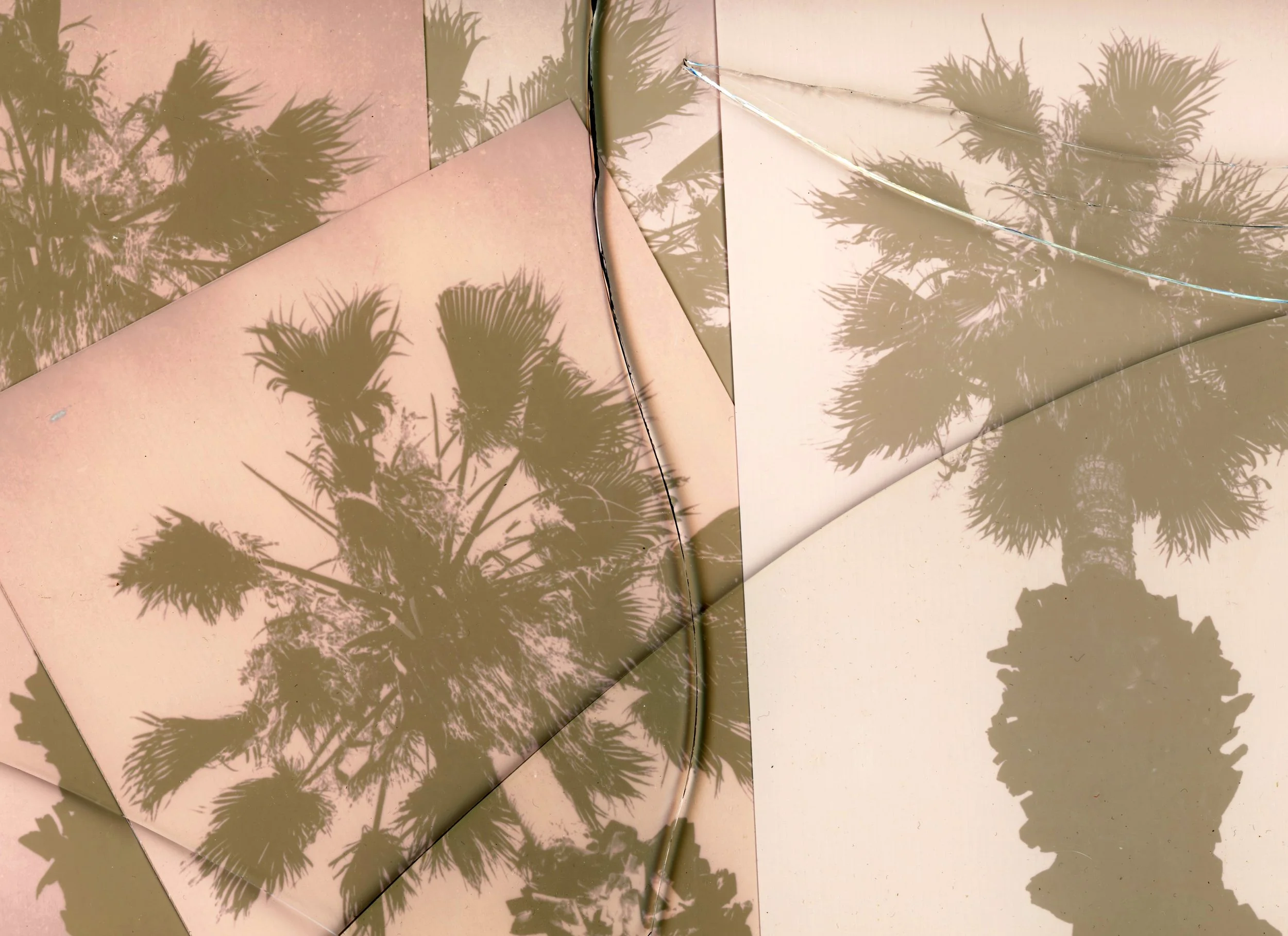 Ici et là, parsemés au sol et sur les murs, d’étranges totems : rideaux ajourés, un palmier démesurément bleu, trente-sept autres palmiers roses, éclats de verre, masques, chiffres, feuilles de calque froissées, fragments de parole en français et en croate…